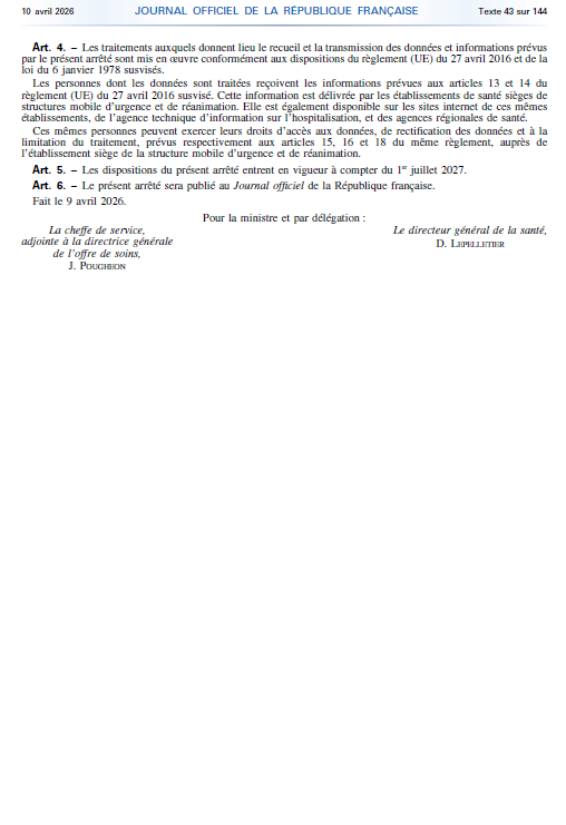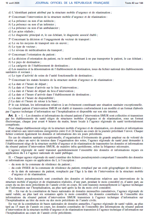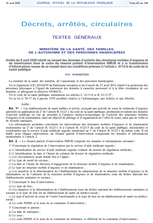 Le 10 avril 2026, la DGOS a publié un nouvel arrêté relatif au recueil des données d’activité des SMUR et à la transmission d’informations via le Résumé Patient d’Intervention SMUR (RPIS).